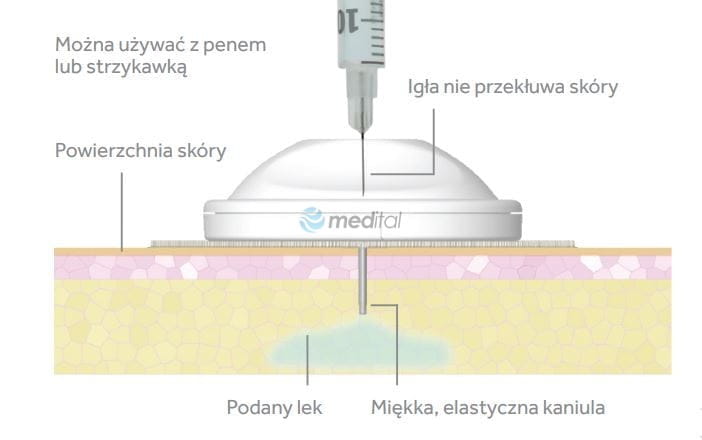 Port do iniekcji leków i-Port Advance® może być stosowany przez pacjentów, którzy wymagają wielokrotnych codziennych wstrzyknięć podskórnych lekarstw, w tym insuliny, przepisanych im przez lekarza. Port można pozostawić podłączony do ciała i stosować do 72 godzin. Można przyjmować zastrzyki z wielu leków.